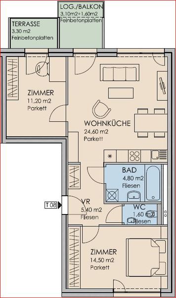 Räume: | Vorraum, Badezimmer, WC, Kinderzimmer, Schlafzimmer mit Terrasse, offene Wohnküche mit Loggia |