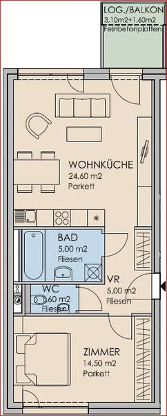 Räume: | Vorraum, Badezimmer, WC, Schlafzimmer und offene Wohnküche mit Loggia |